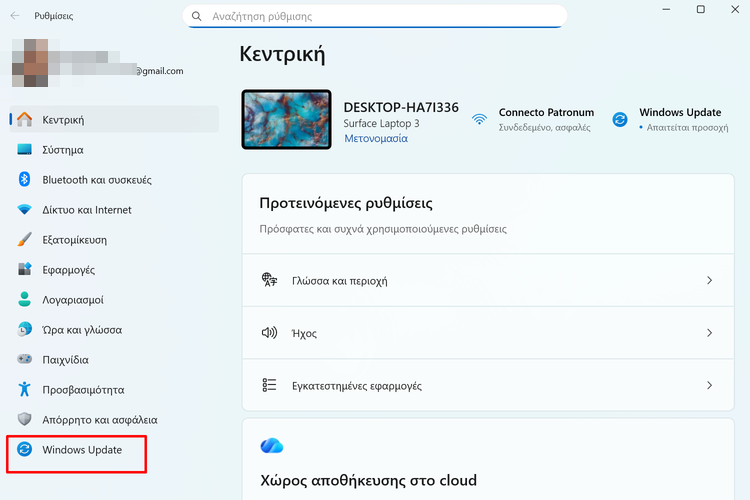 Αλλάζοντας τον τρόπο με τον οποίο το σύστημα διαχειρίζεται τα όρια ταχύτητας, μπορούμε να «ξεκλειδώσουμε» την πραγματική ταχύτητα της σύνδεσής μας. Αρχικά, ανοίγουμε τις ρυθμίσεις του λειτουργικού και πατάμε “Windows Update”.