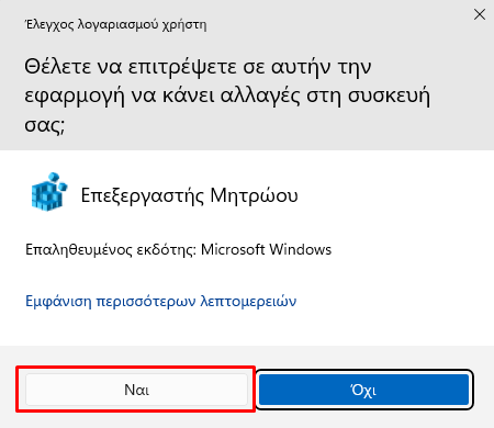 Στο παράθυρο ελέγχου λογαριασμού χρήστη κάνουμε κλικ στο “Ναι”.