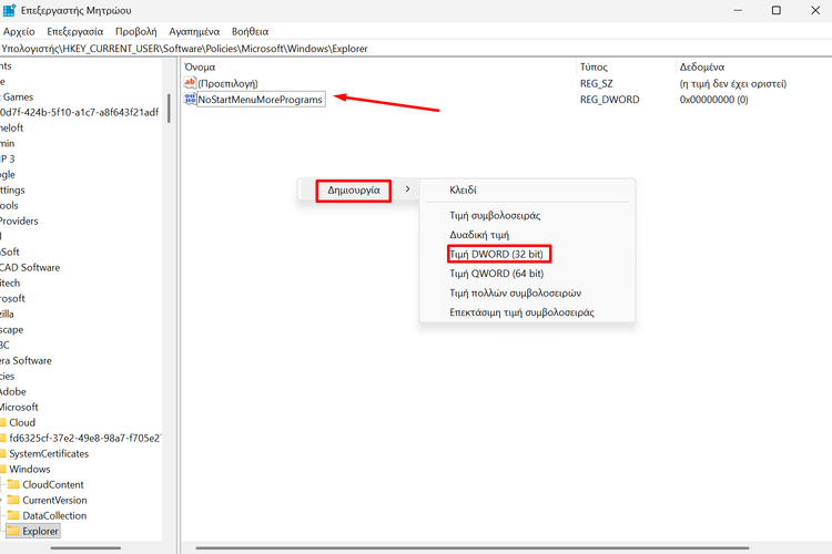 Έπειτα, κάνουμε δεξί κλικ στον κενό χώρο, επιλέγουμε “Δημιουργία → Τιμή DWORD (32-bit)”, και ονομάζουμε τη νέα τιμή “NoStartMenuMorePrograms”.