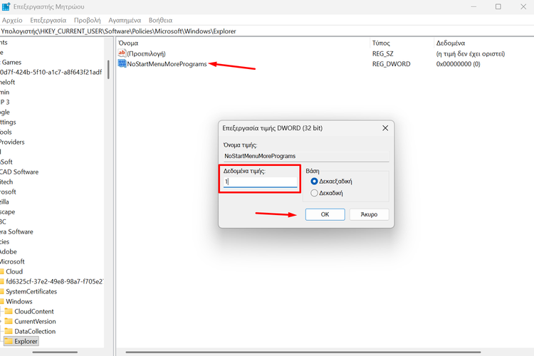 Μετά, κάνουμε διπλό κλικ στο “NoStartMenuMorePrograms”, στα “Δεδομένα τιμής” πληκτρολογούμε “1”, και πατάμε “OK”.