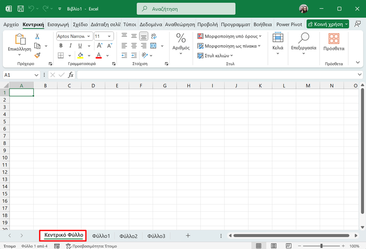 Αρχικά, δημιουργούμε ένα νέο φύλλο και το ονομάζουμε “Κεντρικό Φύλλο”.