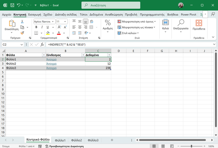 Στη συνέχεια, αν θέλουμε να τραβήξουμε δεδομένα δυναμικά από το ίδιο κελί όλων των φύλλων (π.χ. το κελί B10), χρησιμοποιούμε τη συνάρτηση INDIRECT: