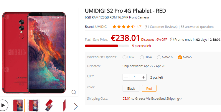 Η τιμή του UMIDIGI S2 Pro ανέρχεται στα €238.01, και διατίθεται σε δυο χρώματα και σε πολύ περιορισμένα κομμάτια. Μπορούμε να το παραγγείλουμε από εδώ με πολύ φθηνή (€5.01), και ταχεία παράδοση από τις Ευρωπαϊκές αποθήκες. Το μαύρο μοντέλο έχει πιο ακριβή αποστολή.
