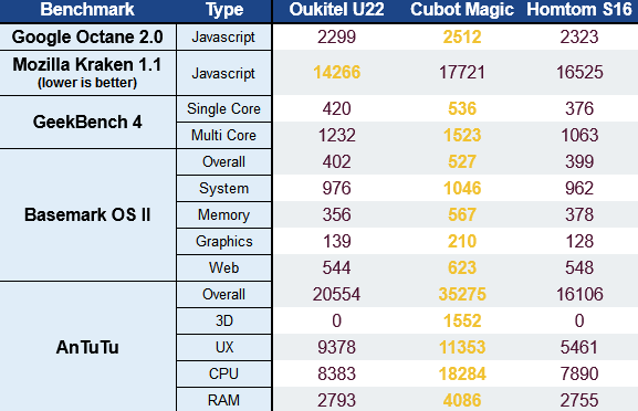 Όπως βλέπουμε, οι επιδόσεις του βρίσκονται πολύ κοντά στο Oukitel U22 που παρουσιάσαμε σε παλιότερο οδηγό, ενώ το Cubot Magic περνάει μπροστά σε όλες τις μετρήσεις.