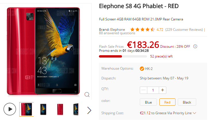 Η τιμή του Elephone S8 ανέρχεται στα €199.93, και μπορούμε να το παραγγείλουμε από εδώ με αποστολή Priority Line για την αποφυγή του τελωνείου.
