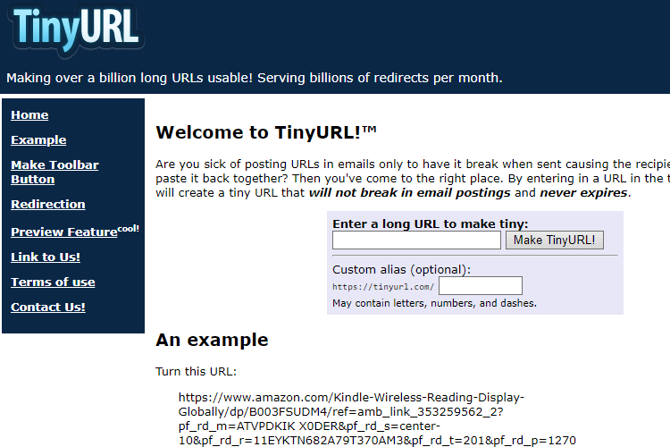 Το ΤinyURL φτιάχτηκε το 2002, και από τότε παρέμεινε το ίδιο. Δεν απαιτεί τη δημιουργία λογαριασμού για τη χρήση του. Aπλά ανοίγουμε τη σελίδα του, γράφουμε τον σύνδεσμο που θέλουμε, και πατάμε “Make TinyURL!”.
