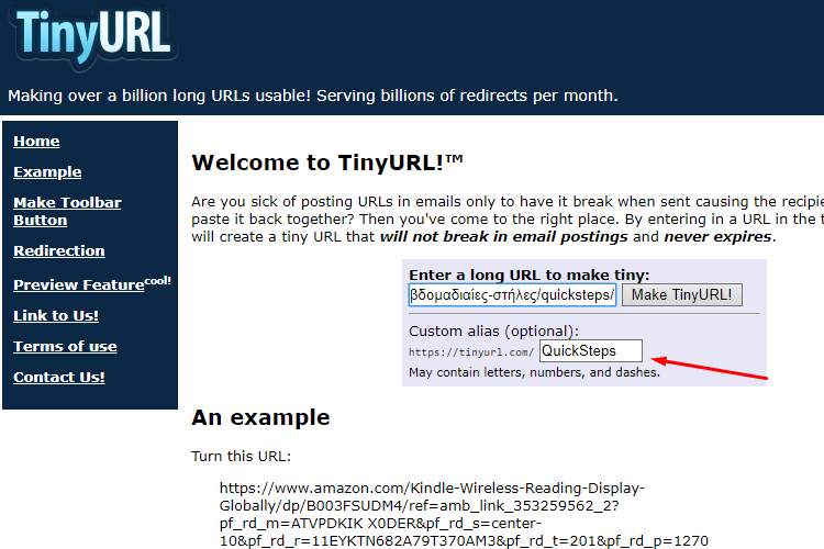 Ταυτόχρονα, στο TinyURL μπορούμε να φτιάξουμε το δικό μας link. Πριν πατήσουμε το κουμπί, γράφουμε στο πλαίσιο του “Custom alias” ό,τι θέλουμε. Έτσι δεν θα δημιουργηθεί ένας τυχαίος συνδυασμός χαρακτήρων, αλλά αυτό που εμείς επιλέξαμε.