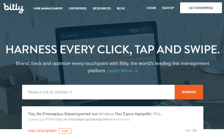 Το bitly είναι το πιο γνωστό και πιο παλιό εργαλείο για συντόμευση συνδέσμων. Επιτρέπει να μικραίνουμε link χωρίς καν την ανάγκη εγγραφής, αλλά έτσι δεν έχουμε τη δυνατότητα να παρακολουθούμε τα στατιστικά των συνδέσμων αυτών.