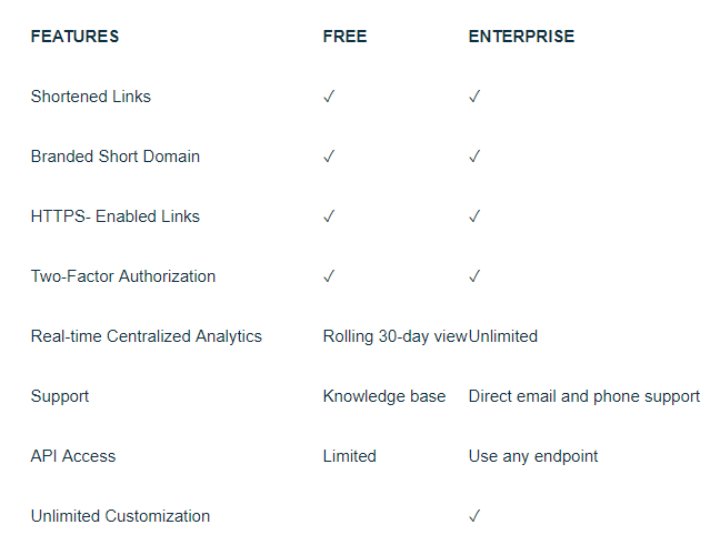 Για όσους διαθέτουν μία αρκετά μεγάλη επιχείρηση, είναι χρήσιμη η Enterprise έκδοση του bitly, η οποία προσφέρει ό,τι η δωρεάν, καταργώντας οποιονδήποτε περιορισμό, και δίνοντας υποστήριξη μέσω email και τηλεφώνου.