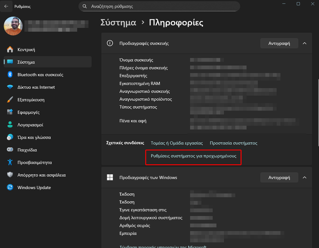 Μετά, εντοπίζουμε και πατάμε τον σύνδεσμο “Ρυθμίσεις συστήματος για προχωρημένους”.