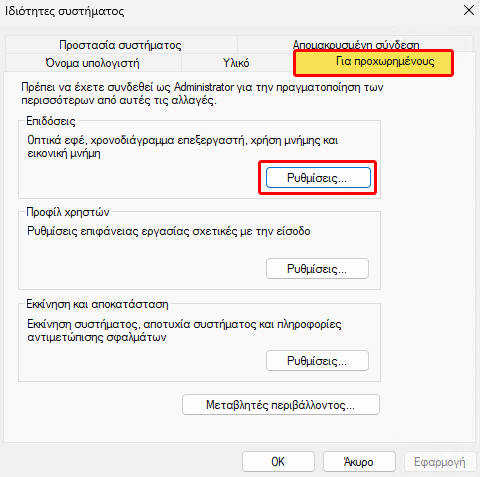 Στο παράθυρο που θα ανοίξει, πηγαίνουμε στην καρτέλα “Για προχωρημένους” και κάνουμε κλικ στο κουμπί “Ρυθμίσεις” στην ενότητα “Επιδόσεις”.