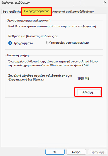 Έπειτα, στο νέο παράθυρο, πηγαίνουμε πάλι στην καρτέλα “Για προχωρημένους” και πατάμε το κουμπί “Αλλαγή” στην ενότητα “Εικονική μνήμη”.