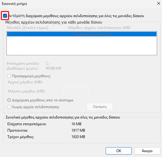 Στη συνέχεια, αποεπιλέγουμε το κουτάκι δίπλα στο “Αυτόματη διαχείριση μεγέθους αρχείου σελιδοποίησης για όλες τις μονάδες δίσκου”.