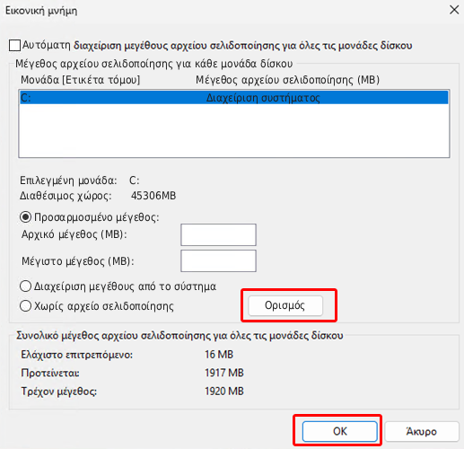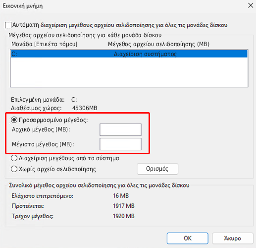 Μετά, επιλέγουμε τον κύριο δίσκο, ενεργοποιούμε το “Προσαρμοσμένο μέγεθος”, στο “Αρχικό μέγεθος” πληκτρολογούμε μία τιμή που αντιστοιχεί στο μέγεθος της RAM του υπολογιστή και στο “Μέγιστο μέγεθος” μία τιμή ίση με 1,5 φορά την ποσότητα της μνήμης του PC.