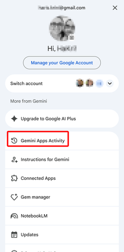 Αρχικά, ανοίγουμε την εφαρμογή του Gemini, πατάμε την εικόνα προφίλ, και διαλέγουμε το “Gemini Apps Activity”.