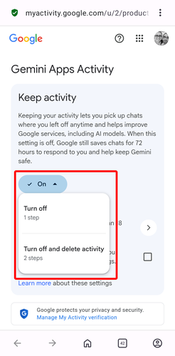 Θα μεταφερθούμε σε ιστοσελίδα. Στην ενότητα “Keep Activity”, πατάμε το “On” και διαλέγουμε το “Turn off and delete activity”.