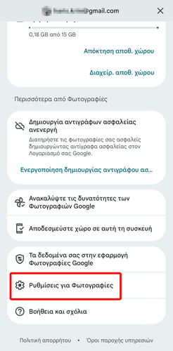 Μετά, ανοίγουμε την εφαρμογή Φωτογραφίες της Google, πατάμε το εικονίδιο του προφίλ, και διαλέγουμε το “Ρυθμίσεις για φωτογραφίες”.