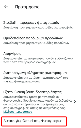 Στη συνέχεια, πατάμε το “Λειτουργίες Gemini στις Φωτογραφίες”.