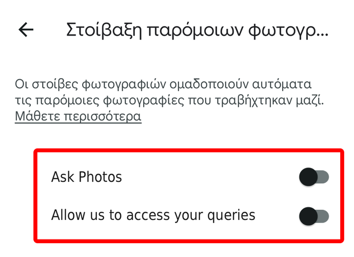 Τέλος, απενεργοποιούμε τον διακόπτη δίπλα στο “Ask Photos” και το “Allow us to access your queries”.