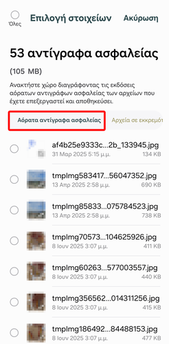 Μετά, πηγαίνουμε στην καρτέλα “Αόρατα αντίγραφα ασφαλείας”, όπου μεταξύ άλλων αποθηκεύονται οι αρχικές εκδόσεις των φωτογραφιών που έχουμε επεξεργαστεί. Αυτά τα αρχεία μπορούμε να τα διαγράψουμε με ασφάλεια, καθώς πρόκειται για διπλότυπα των εικόνων.