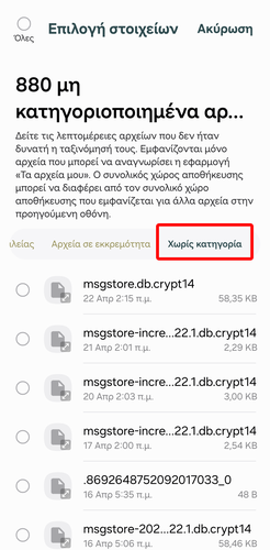 Τέλος, διαλέγουμε την καρτέλα “Χωρίς κατηγορία”, όπου υπάρχουν ογκώδη κρυφά αρχεία και αρχεία που δεν έχουν αποθηκευτεί σε συγκεκριμένους φακέλους για κάποια ουσιώδη χρήση, τα οποία μπορούμε να διαγράψουμε και να απελευθερώσουμε αρκετό αποθηκευτικό χώρο.