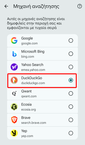 Σε αυτό το μενού, διαλέγουμε τη DuckDuckGo, η οποία παρέχει αυξημένη ιδιωτικότητά σε σύγκριση με τη μηχανή αναζήτησης της Google.