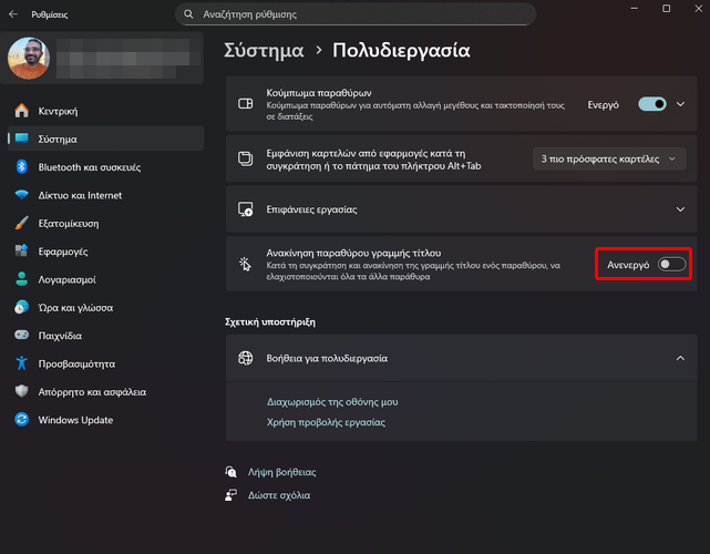 Μετά, εντοπίζουμε το “Ανακίνηση παραθύρου γραμμής τίτλου” και ενεργοποιούμε τον διακόπτη δίπλα του.