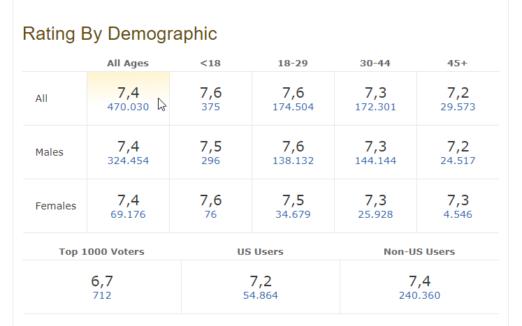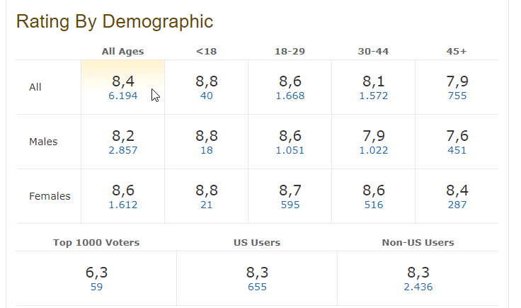 Αν και είναι βέβαιο ότι το γνωρίζουμε, ενδεικτικά αναφέρουμε ότι ο μέσος όρος στο εύρος του επτά, υποδηλώνει ότι πρόκειται ενδεχομένως για ένα καλό έως πολύ καλό έργο, και από το οκτώ και άνω, πρόκειται ίσως για μια εξαιρετική ταινία και σειρά.