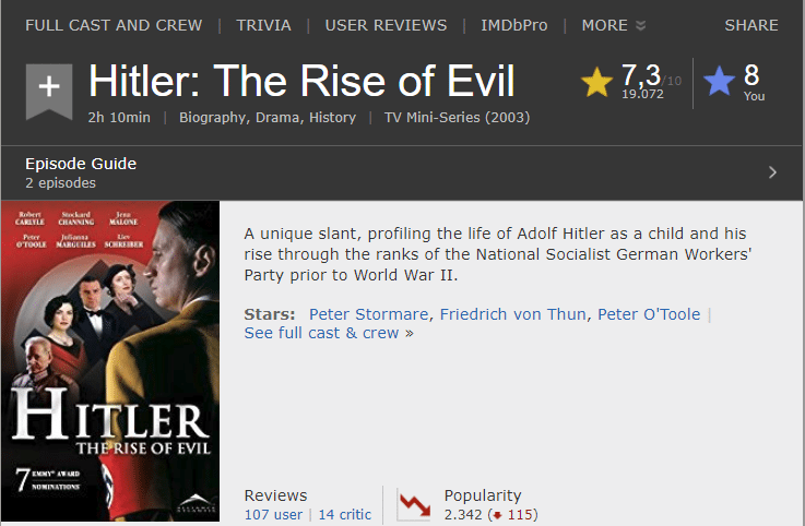 Πρωταγωνιστούν μια πλειάδα πολύ γνωστών ηθοποιών, όπως ο Peter O'Toole, Peter Stormare, Liev Schreiber (o γνωστός μας Ρέι Ντόνοβαν), και ο Robert Carlyle που ερμηνεύει υποδειγματικά τον Χίτλερ.