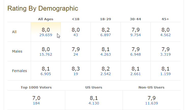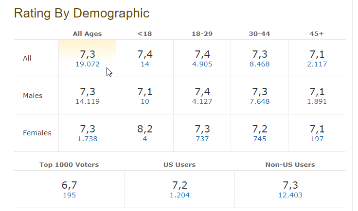Έτσι λοιπόν στην παρακάτω εικόνα βλέπουμε τη βαθμολογία συνολικά (πρώτη κάθετη σειρά), αλλά και ανα ηλικία, που έδωσαν στο Soul Kitchen οι 32.610 σινεφίλ από όλον τον κόσμο.