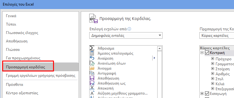 Στα δεξιά του παραθύρου υπάρχει το πλαίσιο προσαρμογής. Αν δεν είναι ήδη επιλεγμένο, στο αναδυόμενο μενού διαλέγουμε τις “Κύριες καρτέλες”.
