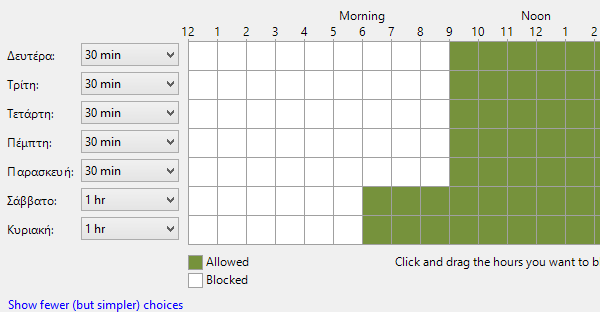 Από τα μενού δίπλα στις ημέρες ορίζουμε το χρονικό περιορισμό, ενώ τα πράσινα τετραγωνάκια είναι οι επιτρεπόμενες ώρες και τα λευκά οι απαγορευμένες.