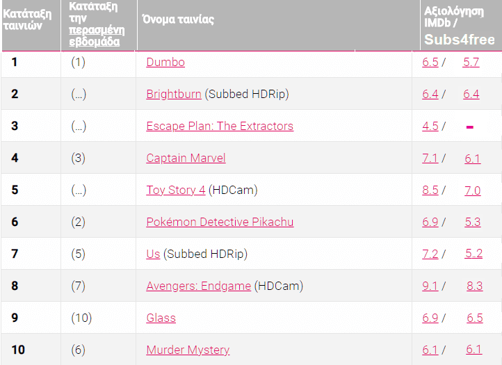 Έτσι λοιπόν, η πρώτη στήλη του πίνακα αριστερά δείχνει σε αύξουσα σειρά το έργο με τις περισσότερες λήψεις. Η δεύτερη μας δείχνει την κατάταξη που είχε η ταινία την προηγούμενη εβδομάδα.