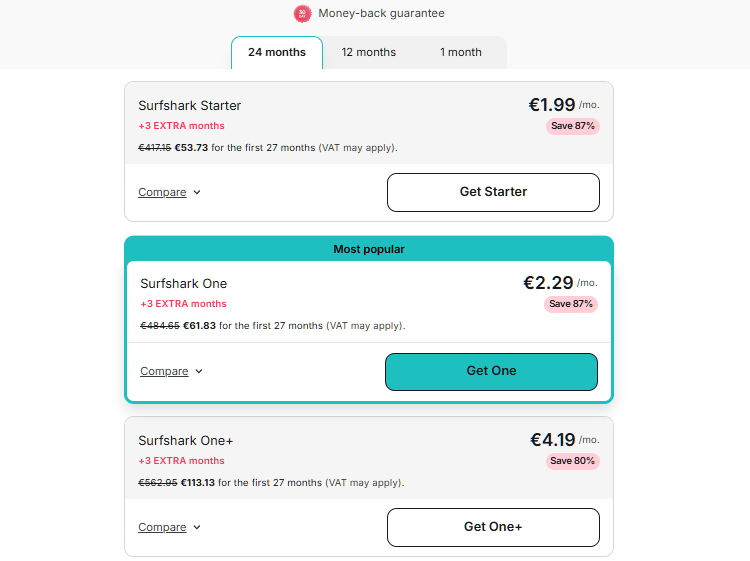 • One: Όλα τα χαρακτηριστικά του Starter, συν έξτρα λειτουργίες ασφαλείας μαζί με το Surfshark Antivirus. Το οικονομικότερο πακέτο είναι το 24μηνο με €2,19 μηνιαίως, συν τρεις έξτρα μήνες δωρεάν.