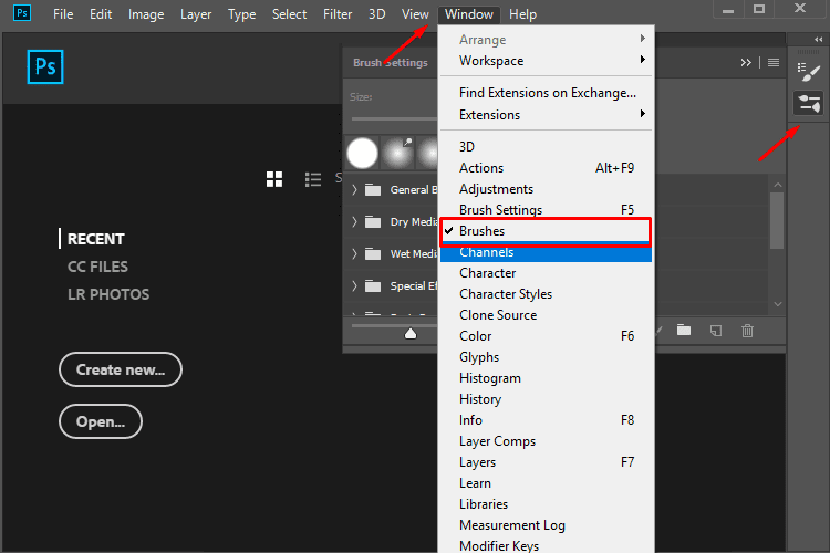 Έχοντας κατεβάσει το αρχείο βούρτσας που θέλουμε, το οποίο έχει κατάληξη .ABR, πηγαίνουμε στο “Window → Brushes”. Με αυτό τον τρόπο εμφανίζουμε το panel των brushes.