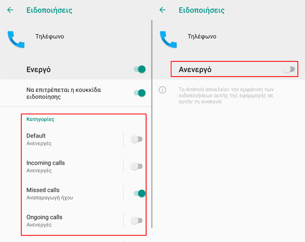 Για κάθε εφαρμογή υπάρχουν πολλαπλά είδη ειδοποιήσεων. Μπορούμε να απενεργοποιήσουμε συγκεκριμένο είδος ειδοποιήσεων, ή γενικά όλες τις ειδοποιήσεις. Σε κάθε περίπτωση γυρνάμε τον ανάλογο διακόπτη στην “Ανενεργό” θέση.