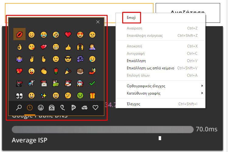 Πλέον μπορούμε να κάνουμε δεξί κλικ σε οποιαδήποτε πλαίσιο κειμένου θέλουμε και να επιλέγουμε το “Emoji”. Με αυτόν τον τρόπο θα εμφανίζεται το σχετικό μενού, κι εμείς μπορούμε να χρησιμοποιούμε φάτσες στα κείμενά μας.