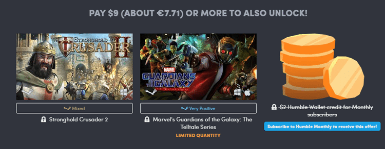 Τέλος, αν πληρώσουμε από 7,71€ και πάνω, παίρνουμε επιπλέον το Stronghold Crusader 2, και το Marvel's Guardians of the Galaxy: The Telltale Series. Μην ξεχάσουμε να αναφέρουμε τα credits αξίας $2 στο πορτοφόλι μας του Humble Bundle.
