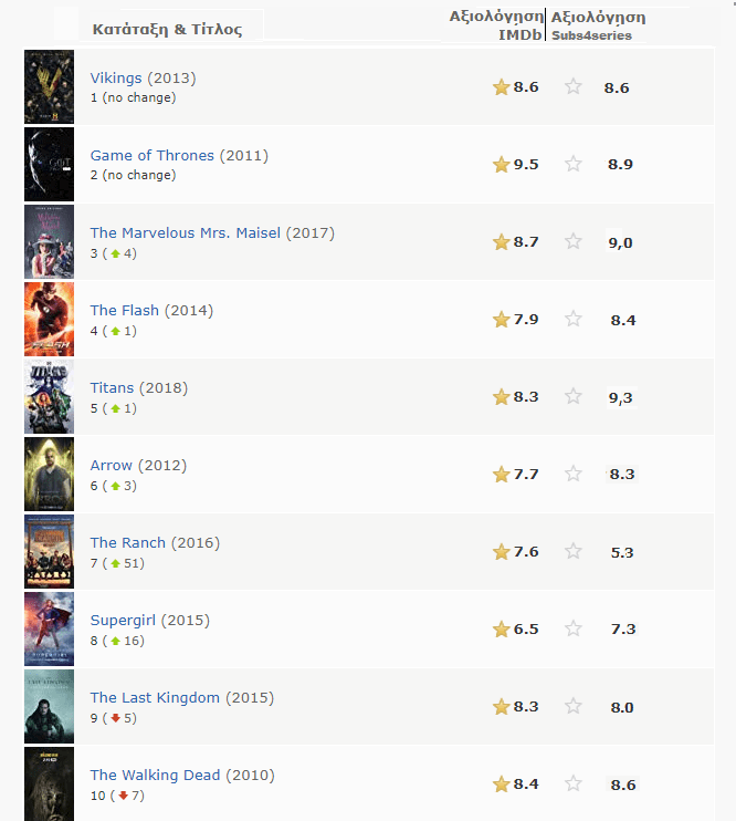 Η τελευταία στήλη δεξιά δείχνει πρώτα τη βαθμολογία από το δημοφιλές IMDb με τις χιλιάδες ψήφους. Ακριβώς δίπλα βλέπουμε τη βαθμολογία στο Subs4Free μόνο από Έλληνες χρήστες.