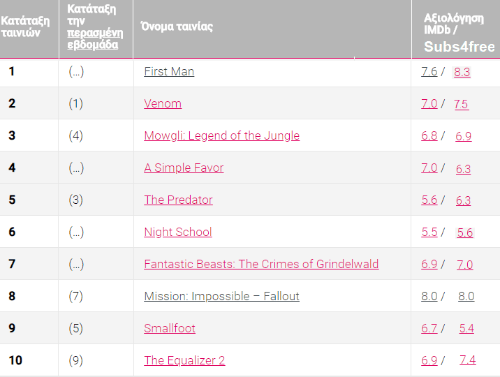 Έτσι λοιπόν, η πρώτη στήλη του πίνακα αριστερά δείχνει σε αύξουσα σειρά το έργο με τις περισσότερες λήψεις. Η δεύτερη μας δείχνει την κατάταξη που είχε η ταινία την προηγούμενη εβδομάδα.