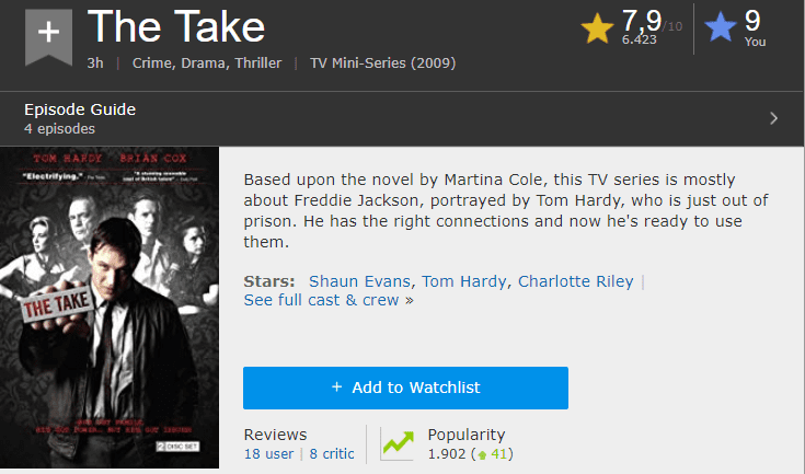 Το “The Take” είναι μια πολύ ωραία αγγλική σειρά τεσσάρων ωριαίων επεισοδίων, που έκανε πρεμιέρα το 2009. Τα κύρια γυρίσματα έγιναν στο Δουβλίνο.
