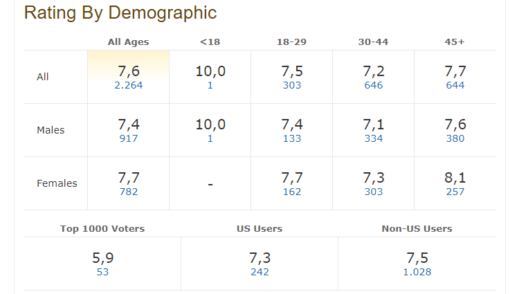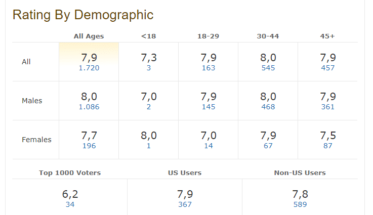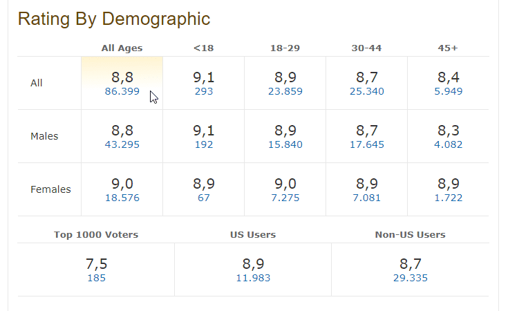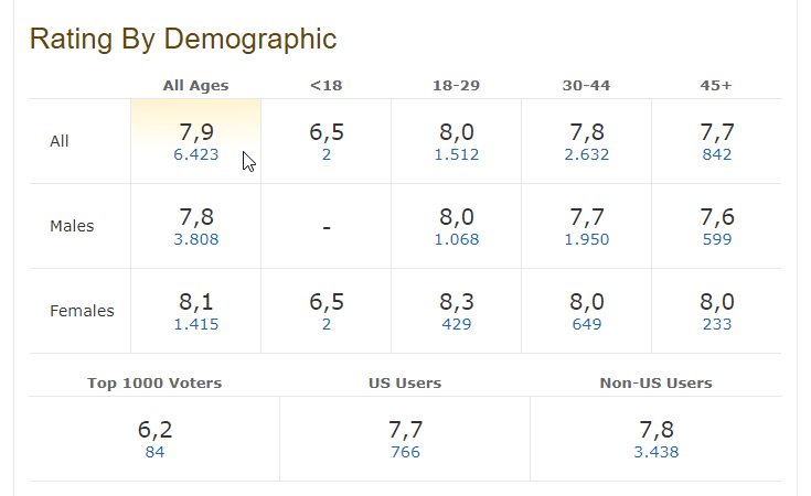 Αν και είναι βέβαιο ότι το γνωρίζουμε, ενδεικτικά αναφέρουμε ότι ο μέσος όρος στο εύρος του επτά, υποδηλώνει ότι πρόκειται ενδεχομένως για ένα καλό έως πολύ καλό έργο. Από το οκτώ και άνω, πρόκειται ίσως για μια εξαιρετική ταινία και σειρά.