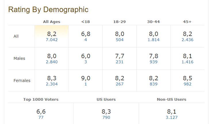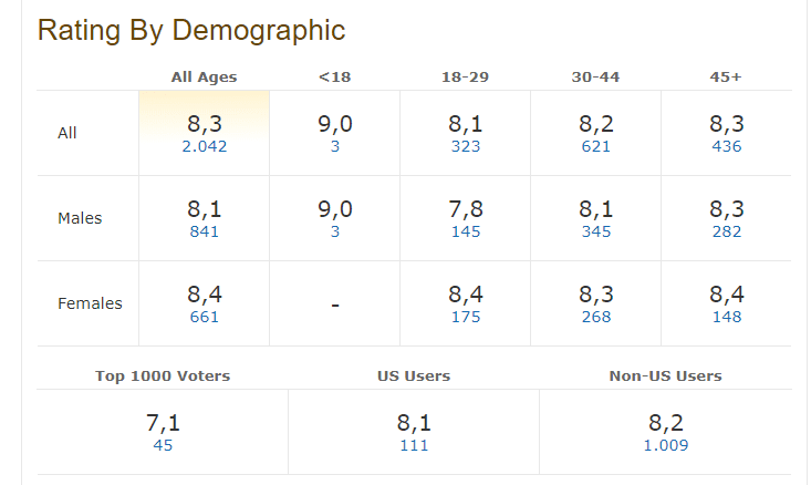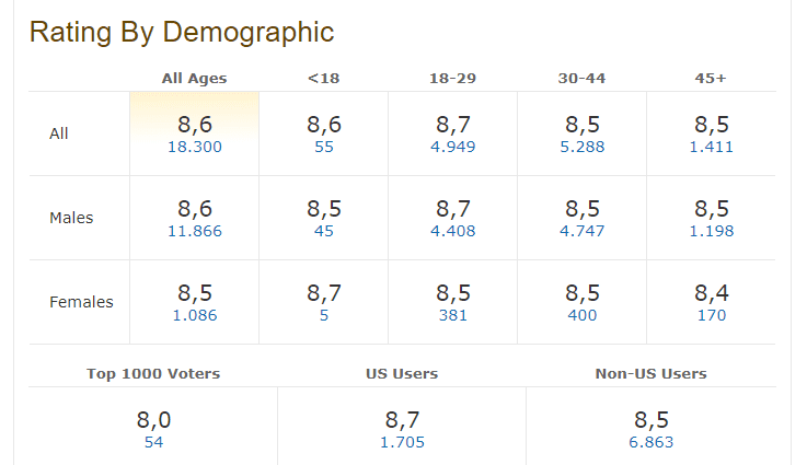 Έτσι λοιπόν, στην παρακάτω εικόνα βλέπουμε τη βαθμολογία συνολικά (πρώτη κάθετη σειρά), αλλά και ανά ηλικία, που έδωσαν στη βρετανική τηλεοπτική σειρά οι 6.423 θεατές από όλον τον κόσμο.