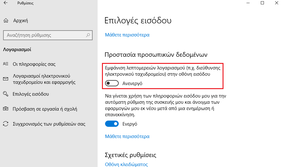 - Κάτω από το «Προστασία προσωπικών δεδομένων», απλά απενεργοποιούμε το «Εμφάνιση λεπτομερειών λογαριασμού (π.χ. διεύθυνσης ηλεκτρονικού ταχυδρομείου) στην οθόνη εισόδου».