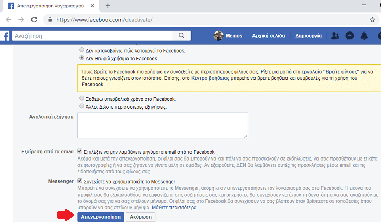 Μπορεί όμως να μην θέλουμε να διαγράψουμε οριστικά το λογαριασμό μας, απλά να τον απενεργοποιήσουμε για ένα διάστημα, για οποιοδήποτε λόγο.