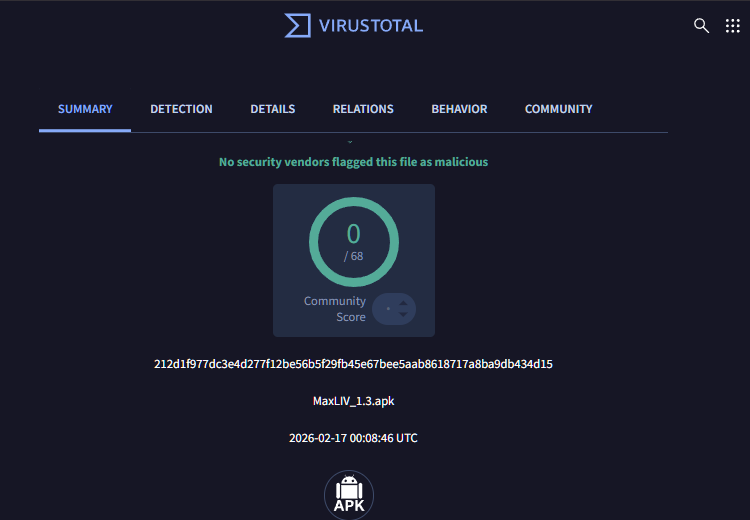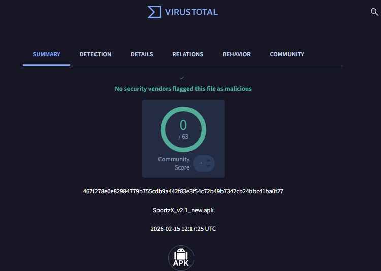 Το SportzX apk θεωρείται απόλυτα ασφαλές και αυτό το επιβεβαιώνει και το VirusTotal όπως παρατηρούμε στο κάτωθι στιγμιότυπο.