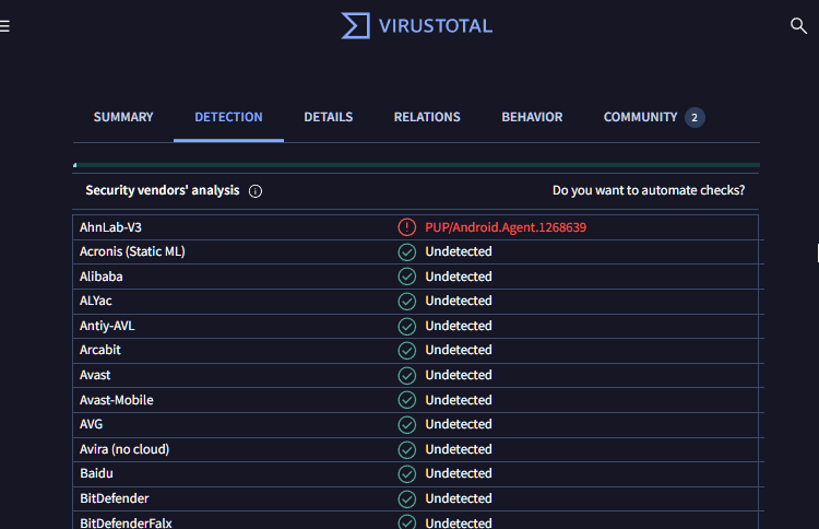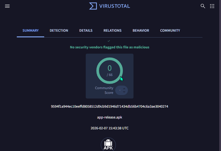 Το apk θεωρείται απόλυτα ασφαλές και αυτό το επιβεβαιώνει και το VirusTotal όπως παρατηρούμε στο κάτωθι στιγμιότυπο.