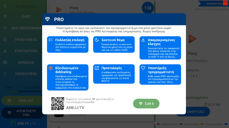Παρότι η δωρεάν έκδοση του Android είναι υπεραρκετή για τους περισσότερους, αν θέλουμε να υποστηρίξουμε τον προγραμματιστή, το ADB TV προσφέρει πολλές ακόμη χρήσιμες λειτουργίες στην Pro έκδοση, όπως παρατηρούμε στην κάτωθι εικόνα.