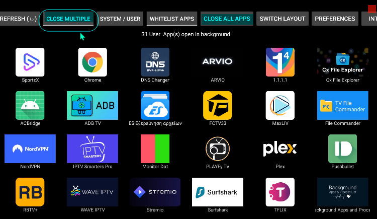 Έτσι, απλά προχωράμε στο κλείσιμο όλων των εφαρμογών, πατώντας στο Close Multiple, όπου το app θα μας επιτρέψει να επιλέξουμε πρώτα τα Android TV apps που θέλουμε να διακόψουμε.