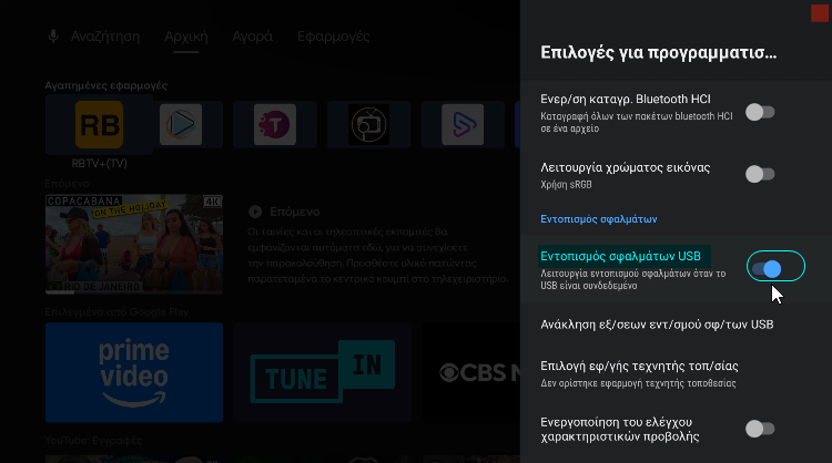 Για να μπορέσουμε να αξιοποιήσουμε το ADB TV, καθώς και το air mouse app που ακολουθεί στη συνέχεια, πρέπει να ενεργοποιήσουμε μια και έξω τις Επιλογές για προγραμματιστές στην Android TV.